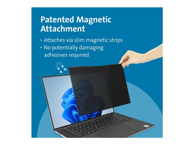 Avec son design ajusté et ses performances exceptionnelles, le filtre de confidentialité magnétique MagPro pour ordinateurs portables 16" (16:10) se fixe et se retire aisément, tout en permettant aux ordinateurs portables ultra-fins de se fermer complètement et d'entrer en veille. Réduit le champ de vision à ± 30° pour renforcer la sécurité visuelle et empêcher toute personne non autorisée de les examiner, au bureau comme dans un lieu public. Une découpe pour webcam garantit une expérience de visioconférence fluide. Grâce à la réduction de la lumière bleue, les rayons nocifs sont filtrés jusqu'à 30 %, ce qui réduit la fatigue visuelle et évite la perturbation de vos cycles de sommeil. Le filtre réversible inclut un revêtement antireflet afin d'optimiser la clarté des informations à l'écran. Le filtre est doté d'un côté mat qui réduit les reflets et les traces de doigts, tandis que le côté brillant offre une meilleure visibilité de l'écran. La fixation magnétique brevetée est pratique et évite l'utilisation d'adhésifs qui pourraient endommager l'appareil. Garantie limitée de 2 ans incluse.