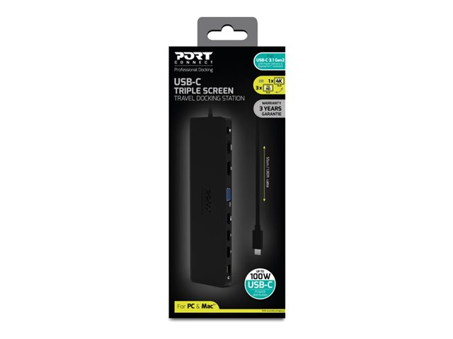 La station d'accueil USB-C 901906-W de PORT Connect permet de connecter jusqu'à 11 périphériques sur un seul port USB-C de votre ordinateur. Elle permet d'afficher jusqu'à 3 écrans additionnels en résolution 1080p full HD ou 1 écran en Ultra HD 4K. Compatible avec les ordinateurs PC & Mac en USB-C, elle permet de recharger son appareil jusqu'à 100W. Son design compact et sa fonction d'auto-alimentation la rendent parfaitement adaptée à la mobilité.