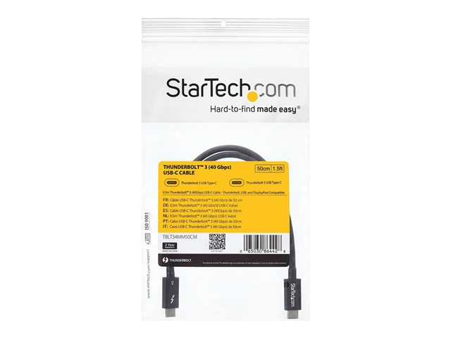 StarTech.com 50cm (1.6ft) Thunderbolt 3 Cable, 40Gbps, 100W PD, 4K/5K Video, Thunderbolt-Certified, Compatible w/ TB4/USB 3.2/DisplayPort