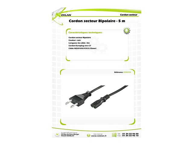 Description du produit Neklan Bipolar - câble d'alimentation - Europlug pour power IEC 60320 C7 - 5 m Type Câble d'alimentation Longueur 5 m Connecteur Europlug (alimentation CEE 7/16) - mâle Connecteur (deuxième extrémité) Power IEC 60320 C7 Couleur Noir -