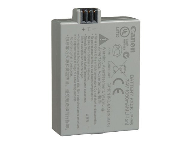 Description du produit Canon LP-E5 pile pour appareil photo - Li-Ion Type de Produit Pile pour appareil photo Batterie Lithium Ion Conçu pour Canon LC-E5, LC-E5E; EOS 1000D, 450D, 500D, Kiss F, Kiss X2, Kiss X3, Rebel T1i, Rebel XS, Rebel XSi -
