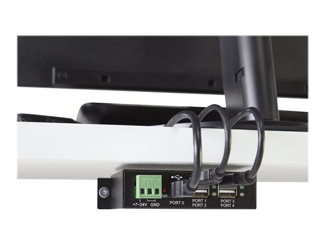 Ce hub USB industriel offre des performances fiables, tout étant équipé d''un boîtier métallique pour une utilisation intensive. La vaste plage d''entrée en courant continu de son bornier (7 à 24 V CC) vous permet d''alimenter le hub selon vos besoins, en fonction de vos propres capacités d''entrée d''alimentation.